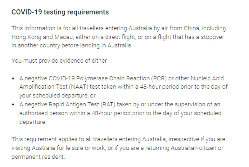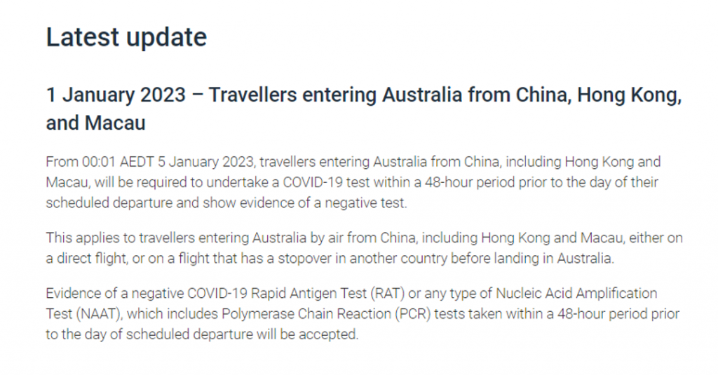 据澳大利亚内政事务部在1月1日发布的最新消息称,从2023年1月5日0点(悉尼时间)开始,所有从中国(包括香港和澳门)入境澳洲的旅客将需要提供48小时阴性核酸检测证明。