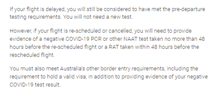 • 但是,如果您的航班改期或取消,您将需要提供在改期航班前不超过48小时内进行的COVID-19 PCR或其他NAAT检测呈阴性的证据,或在改期航班前48小时内进行的RAT检测。