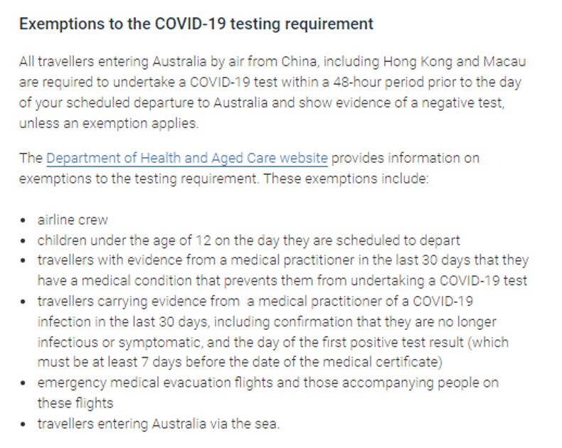 除了以上的几种情况必须要做核酸外,澳洲政府特意声明以下的几类人入境澳洲时不需要提供48小时核酸证明。