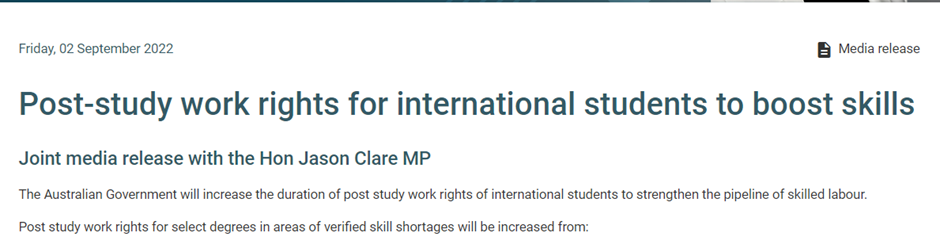 2022年9月初,根据澳内政部长在官网发布的文章,为吸引更多技术劳动力留在澳洲,澳洲政府将延长留学生毕业后的工作权利期限。