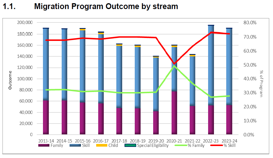 根据澳洲移民局的最新报告,23-24财年共计发放了190,000个永居签证,达到了年度配额上限。各类签证的申请积压现象依旧显著,这说明澳洲永居需求旺盛。