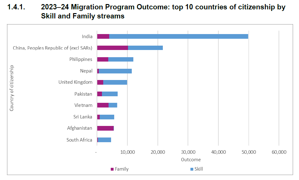 来源国方面,23-24财年印度公民获得了最多的永居移民项目签证,共49,848个;紧随其后的是中国,有21,806个;其他上榜国家包括菲律宾、尼泊尔、英国和巴基斯坦。