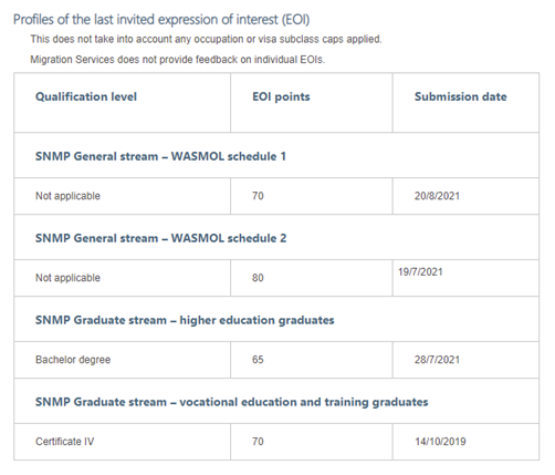 Higher education graduates邀请至2021年7月28日的65分;VET Stream 邀请至2019年10月14日的70分。