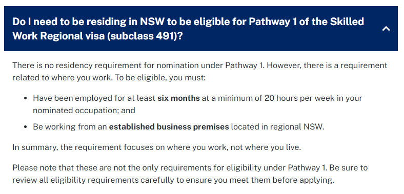 换句话说,目前在悉尼的申请人如果正在远程为办公室位于偏远地区的雇主工作,完全符合这个途径的要求,可以考虑直接向新州政府提交提名申请,下签后再前往偏远地区定居!
