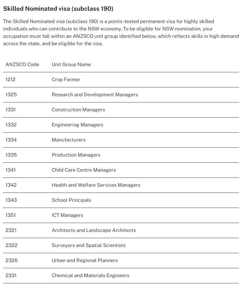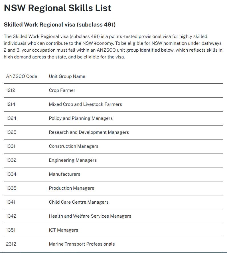 正如之前新州政府披露的信息,今年的新州职业列表一共有两个,分别适用于NSW190和NSW491的Pathway 2和Pathway 3,均按ANZSCO Unit Group职业组列出。