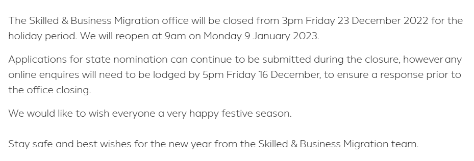 首先是南澳政府方面,宣布了州担审理部门将于2022年12月23日下午3点关闭,2023年1月9日重新恢复正常上班。放假期间申请人们可以继续提交提名申请,但是关于州担的任何咨询最好在2022年12月16号移民局办公室下班前提交,以确保在放假前可以得到回复。