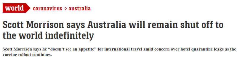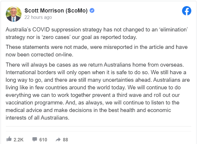 他在Facebook上表示:“澳大利亚的新冠肺炎防控战略没有转变为‘消灭’战略,‘零病例’也不是我们报道的目标。”“当澳洲人从海外回国时,总会有一些病例出现。国际边界只有在安全的情况下才会开放。”