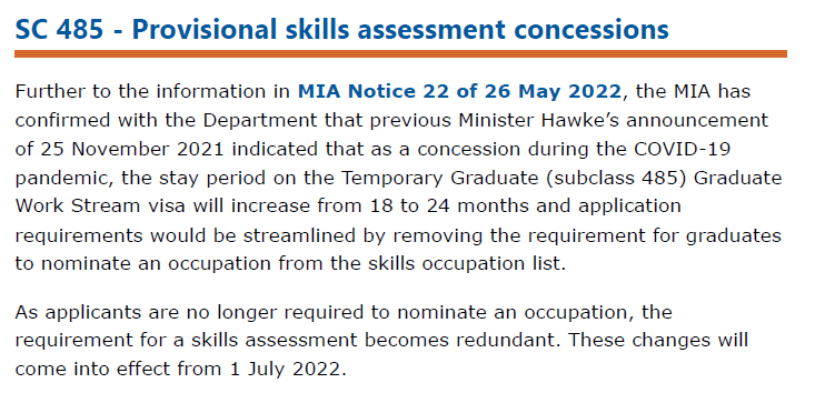 澳大利亚移民研究所MIA(Migration Institute of Australia)已与澳大利亚移民局确认,VET类课程(技能课程)毕业生的485签证有效期将从18个月增加到24个月。同时,申请485签证时无需再进行职业预评估。