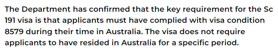 MIA的解读指出,目前的8579条款没有关于在澳洲停留时间的具体规定。换句话说,只要在持签期间遵守8579的偏远地区义务 (不去非指定区域定居) ,即便居住时间不满三年,也不会直接影响191的申请。
