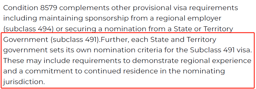 但在签证条款8579中,虽然明确规定491/494持有人在澳洲期间只能在偏远地区生活、工作、学习,却并未设定必须“连续居住三年”的时间要求。也就是说,澳洲移民局目前、从这个条款来看,没有对491/494持有人的偏远地区生活时间有要求!