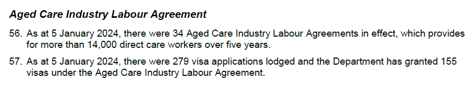 一组比较有趣的数字是关于2023年上半年宣布的老年护理劳工协议。截至2024年1月5日,共有34家雇主成功签订了该协议,并且已递交了279份签证申请、155份获批。
