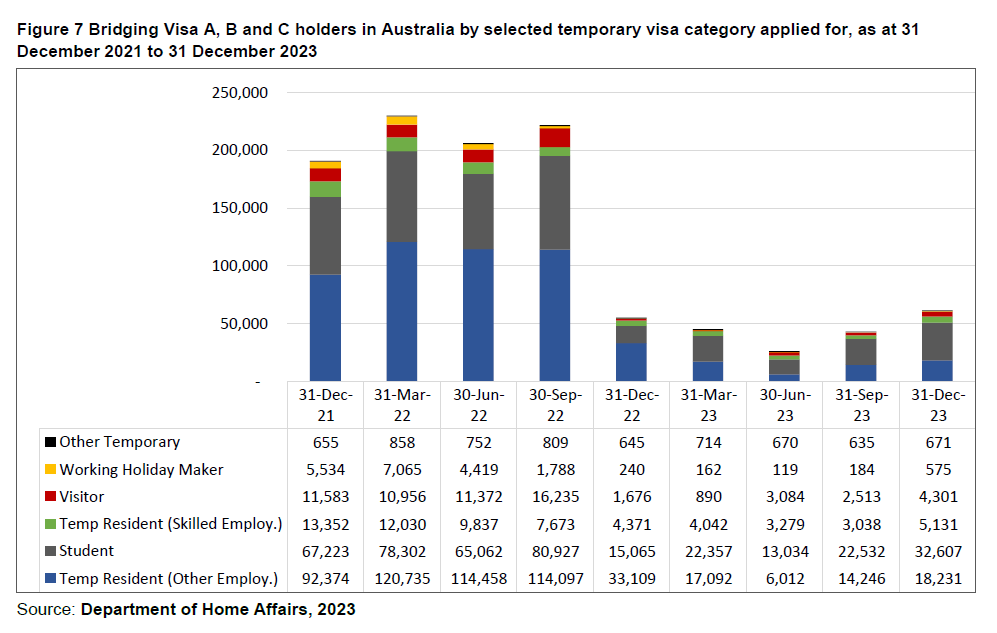 截至2023年12月31日,澳洲有211,570名过桥签证持有者 (BVE持有人不包括其中),主要是由于境内学生签证申请数量的增加,以及相对放缓的审理速度导致的。