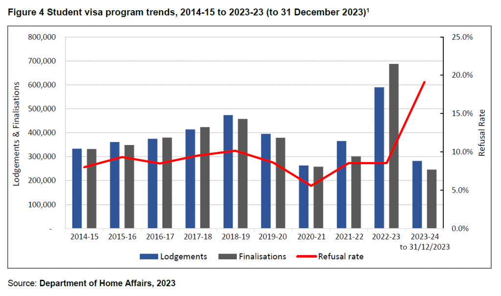 再具体到学生签证的数据,我们将得到一个令人惊讶的事实,那就是2023年的下半年里,学签的拒签率来到了近十年的最高点!也能进一步反映澳洲政府目前对于加强学生签证审理、打击学签滥用行为的决心。