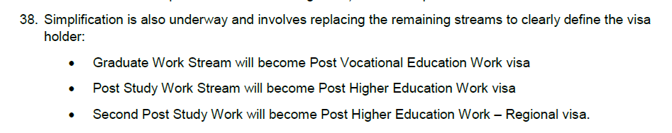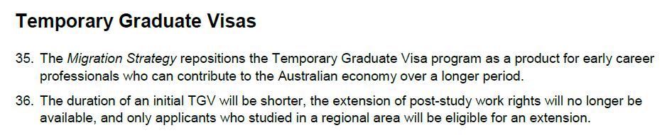 在毕业生签证方面,这份文件再次重申了此前移民战略中,将485签证重新定位于“能够在较长时期内为澳大利亚经济做出贡献的专业技术人才的早期签证选择“的说法,确认缩短485签证长度、特定课程毕业生延期政策将会取消、只有偏远地区学生可续485等种种安排,并公布了针对485签证简化的细节,包括: