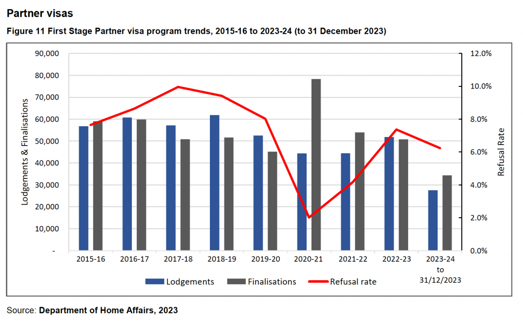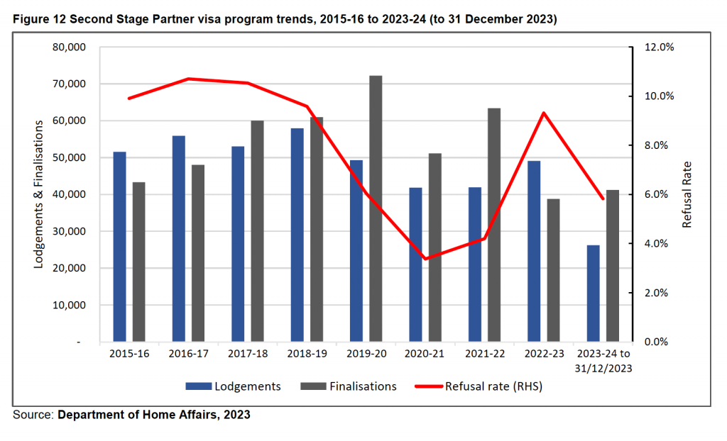 配偶移民方面,截至2023年12月31日,移民局一共发放了31,291个820签证,比上一年同期增长 61.6%,正在审理当中的申请为52,780 份,与23年6月30日相比下降了9.8%;801签证方面,截至2023年12月31日,共发放了37,764份801签证,比去年同期增长188.7%,且正在审理中的801申请为29,335份,与23年6月30日相比下降了38.4%。