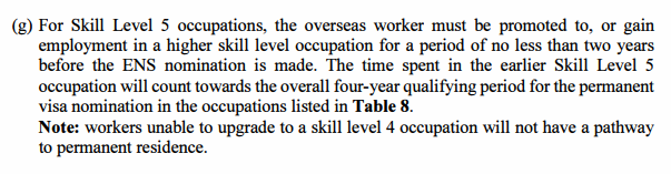 对于技能等级 5 的职业,在获得 186雇主担保提名之前,申请人必须晋升、从事更高技能等级职业的工作不少于两年。无法升级到技能等级 4 职业的签证持有人将无法获得永久居留权。