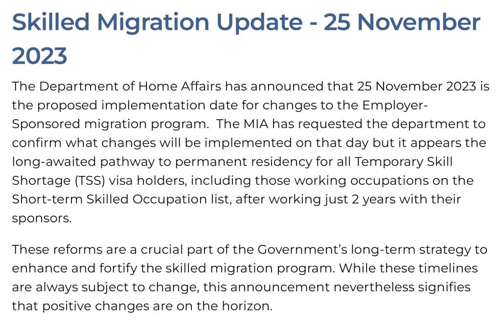 在通知里,MIA告知各位代理,他们正在与移民局确认哪些变更即将实施,但预计即将实施的新政主要还是围绕扩大482转186的职业范围、所有职业482满2年即可186等比较清晰直接的调整而展开。同时,MIA也提醒道,11月25日是移民局目前暂定的日期,不排除后续有推迟的可能。但无论如何,这是一个积极的信号。