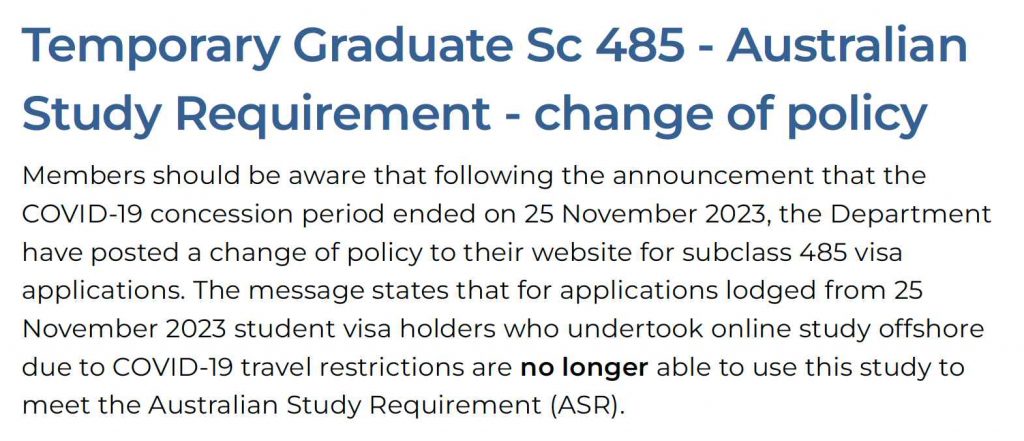 上面明确写道,从2023年11月25日起,对于新递交的485签证申请,因疫情限制而在境外完成网课的部分将不能再用于满足澳洲学习经历的要求!