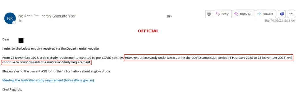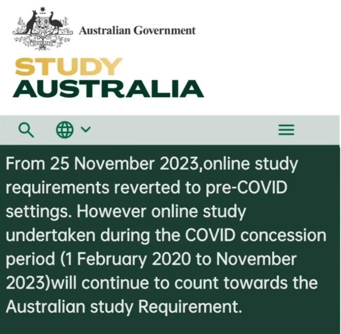 首先是一些中介收到了移民局的回复,在邮件里写到,2020年2月1日至2023年11月25期间的网课学习经历可以用于满足澳洲学习经历。