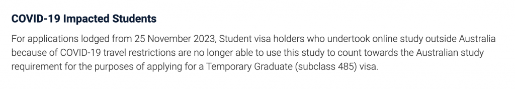 上面明确写道,从2023年11月25日起,对于新递交的485签证申请,因疫情限制而在境外完成网课的部分将不能再用于满足澳洲学习经历的要求!