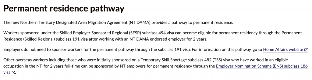 官网已经写明,除494、491签证外的其他有工作权利的临时签证持有人,为NT DAMA雇主全职工作2年(兼职可折算)后,即可申请186签证!