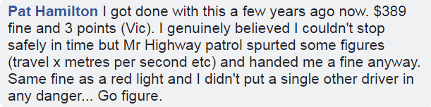 几年前我就被罚过。是在维州,被罚了$389,扣了3分。我当时真的认为,我没有办法及时地安全停下来,但是高速公路的巡警快速计算了一下(行程×每秒距离等等),还是给我开了罚单。罚款金额和闯红灯是一样的,而我当时的行为并没有给其他任何一个司机造成危险...