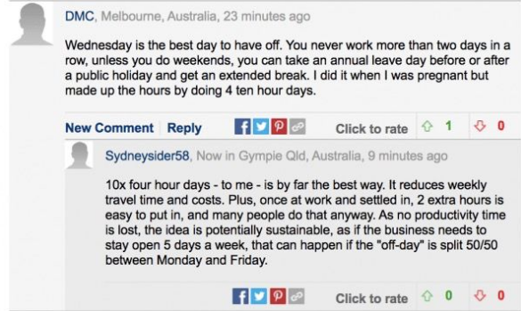 网友也纷纷发表自己的意见,一人说:“周三是休假最好的一天。这样就不用连续工作超过两天,除非你周末工作,否则你可以在公共假日前后休年假,并获得延长的假期。我怀孕的时候就是这样做的,但是用每天工作10小时,每周工作4天来弥补时间。”