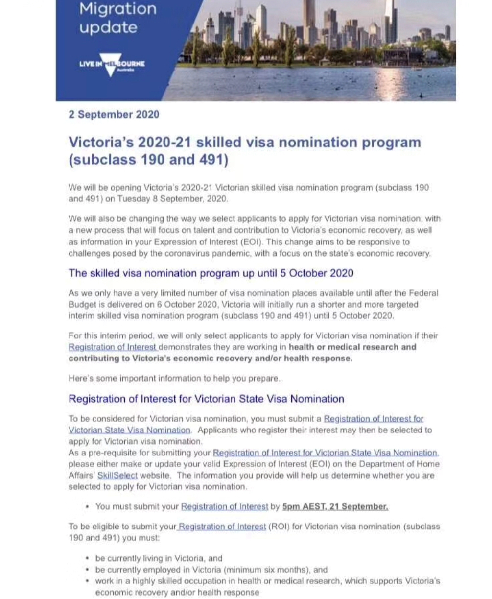 昨天维州政府颁布了最新190/491政策,本次更新的临时政策是针对应对新冠疫情以及帮助维州经济复苏,所以仅在9月8日至10月5日期间有效。州担保申请将于9月8日开启,最晚需要在9月21日下午5点之前提交新增步骤:Registration of Interest (ROI)。